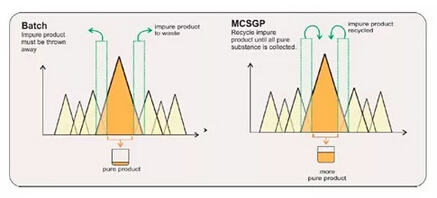 ? ? ? MCSGP(Multicolumn Countercurrent Solvent GradientPurification)用于精純環節,無需通過耗時的實驗設計(DoE)確定工藝條件,可有效克服典型SMB(模擬移動床)僅適用于二元分離、無法實現線性梯度的缺點。