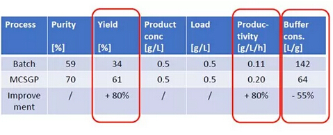 ? ? 有案例證明,MCSGP可將產品純度從傳統工藝的59%提升至70%,將收率從傳統工藝的34%提升至61%,從而使產量(g /L /h)整體提升80%,并同時使Buffer的消耗量降低55%。MCSGP工藝,無疑可顯著地節約成本投入,并可產生更多的生產效益。