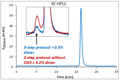? ? ? ?最終產品經SE-HPLC檢測,純度高達99.5%,二聚體含量僅為0.5%,比Protein A - Desalting兩步層析所得產品的二聚體含量降低近6倍,該產品可直接用于氨基酸序列測定、二硫鍵測定以及糖型分析等高純度要求的檢測。