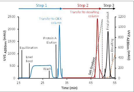 ? ? ? ?在該過程中,Protein A的洗脫組分經過在線稀釋,直接上樣至CIEX層析柱,CIEX進行線性洗脫,去除降解物及聚集體,將目標組分直接上樣至脫鹽柱。三步層析緊密銜接,前一步層析的洗脫與后一步層析的上樣同時進行,使得純化效率顯著提高。