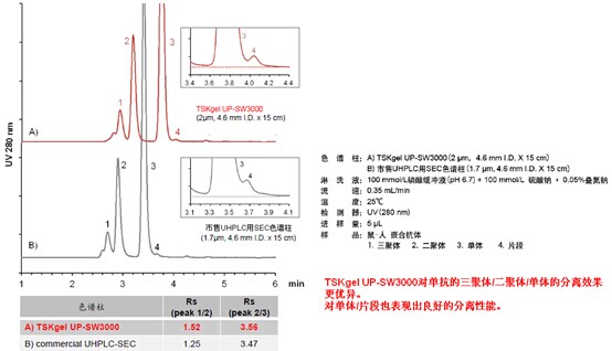 3.?填料的特性(孔隙容量、校正曲線的斜率等)與TSKgel?G3000SWXL相同,所以非常適合用來(lái)分離抗體(IgG)二聚體、單體、抗體片段。