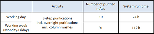 ??采用Protein A - CIEX - Desalting三步向導模塊,每次上樣10 mL單抗上清液(1.0 mg/mL),每次產量均≥6.5 mg。單個樣品的純化耗時約為74 min,在24 h內純化出多達19個樣品!而且該時間包含了層析柱的清洗環節。該系統持續運行5天,純化樣品總數量高達91個。