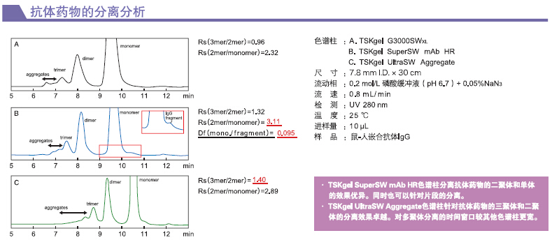 TSKgel SuperSW mAb 系列色譜柱,是使用了粒徑4 μm的硅膠基質(zhì)為填充材料的SEC色譜柱,適用于分析蛋白質(zhì)。與TSKgel G3000SWXL 具有相同的分離范圍,可以分離分子量范圍很廣的蛋白質(zhì)。特別是針對(duì)抗體藥物中的二聚體、單體、抗體斷片,具有優(yōu)異的分離效果。抗體藥物中多聚體(三聚體及多聚體)的分析,則使用TSKgel UltraSW Aggregate色譜柱時(shí)的分離效果更佳。高分辨率分析可使用7.8 mmI.D.×30 cm尺寸的TSKgel SuperSW mAb HR色譜柱。快速分