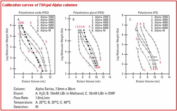 TSKgel Alpha色譜柱是專為中間極性聚合物的GPC分析所開發(fā)的產(chǎn)品。與PW和PWxl型色譜柱一樣,TSKgel Alpha色譜柱內(nèi)的填料顆粒也具有羥基化甲基丙烯酸聚合物骨架,不過其交聯(lián)度卻高于PW和PWxl型色譜柱,從而可以將填料在極性有機溶劑中的溶脹減小到最低。它非常適合于在甲醇、乙醇、DMF、THF、HFIP、DMSO、2-丙醇和乙腈等極性有機溶劑體系下進行分析聚合物。