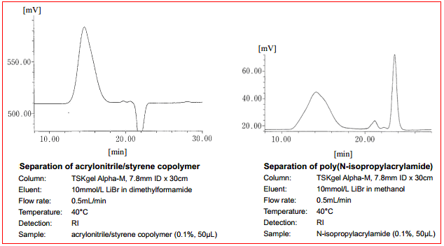 TSKgel Alpha色譜柱是專為中間極性聚合物的GPC分析所開發的產品。與PW和PWxl型色譜柱一樣,TSKgel Alpha色譜柱內的填料顆粒也具有羥基化甲基丙烯酸聚合物骨架,不過其交聯度卻高于PW和PWxl型色譜柱,從而可以將填料在極性有機溶劑中的溶脹減小到最低。它非常適合于在甲醇、乙醇、DMF、THF、HFIP、DMSO、2-丙醇和乙腈等極性有機溶劑體系下進行分析聚合物。TSKgel Alpha-M色譜柱是校正曲線線性范圍較寬的混合柱。