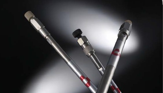 TSKgel NH2-100 DC 3μm 以鍵合了氨烷基的硅膠填料裝填了與后段的分析柱可以直接連接的色譜柱。不使用連接管也可連接2根色譜柱,可減少導致分離性能降低的死體積,2根分離模式不同的色譜柱的一體化,使用起來更方便。鍵合的氨基作為陰離子交換基發揮作用,協助完成后段色譜柱的分離,從而實現更好的分離成為可能。特別是與反相色譜柱的連接,醫藥品中的藥效成分和共存陰離子的同時分析成為可能。