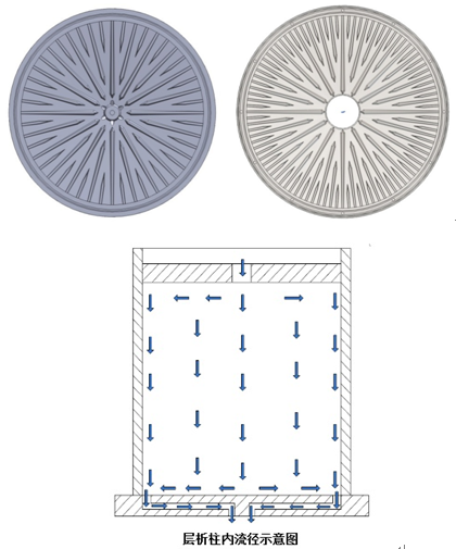 分配器按照現代機械設計先進理念進行的,流體動態仿真、優化設計、可靠性設計、虛擬設計、三維造型、產品全壽命周期設計,使得產品性能得到有一種單一的中央噴口和一種徑向導流槽。防直噴的噴口與導流槽做在了一起,定位在每個單元的中心,防止噴出的液體直接進入柱管而不通過分配器。獨特的分配器設計,保證所有流徑長度相同,從而更有效地保證分配效果。