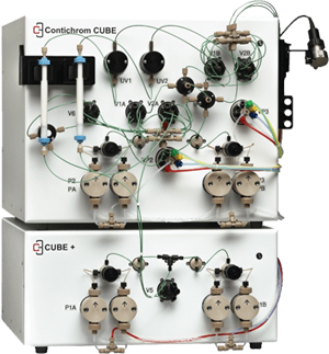 所有的Contichrom系統(tǒng)可以將兩個層析步驟(例如捕獲和精純)整合為一個單一的過程,第一步層析洗脫的產(chǎn)物可以直接被稀釋,從而直接進行第二步層析,因此省略了中間的間歇過程,這是非常適用于高通量純化的。