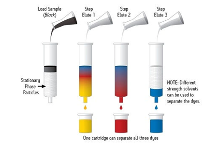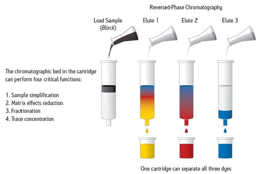 SPE通常是一種使用裝在柱芯型裝置內的固體顆粒和色譜填充材料對樣品中的不同組分進行化學分離的樣品制備技術。樣品幾乎始終呈液態,但特殊應用項目可能使用氣相中的某些樣品進行。圖1顯示出一份樣品(圖示為黑色)正在使用SPE裝置進行處理,以使組成該樣品的每種染色組分通過色譜分析實現分離。