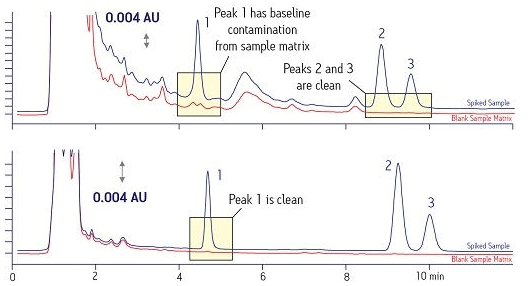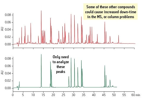 另一種考慮是存在于樣品基質中的各種干擾物在每次進樣時可能會蓄積導致儀器停機。如果這些干擾物能在樣品制備期間被除去,那么目標化合物就能使用一種更簡單、更穩定的方法進行分析(圖3)。此圖將位于靠上位置的原始樣品與位于靠下位置的經SPE制備后的新樣品進行了比較。