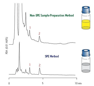 圖5給出了另一個示例??可系淖V圖表明化合物#1和#2均受到樣品基質引起的明顯干擾??肯碌淖V圖表明使用SPE進行適當樣品制備后可顯著提高結果質量(基線干凈)。請注意,一條明顯更干凈的基線可提高分析結果的準確度。如果該樣品需要對化合物進行分離和純化,那么也可以獲得一種純度明顯更高的萃取物。