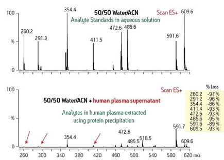 我們可以在圖6中看到這種效應。靠上的質譜圖代表了目標化合物以生理鹽水作為溶劑進樣時所獲得的信號??肯碌膱D譜表明當相同的化合物在人血漿中進行分析時引起信號響應顯著降低(抑制比例>90%)。在靠下的圖譜中,只進行了一個常見的蛋白沉淀步驟。這種技術不能清除可引起離子抑制的基質干擾物,從而導致信號響應差。