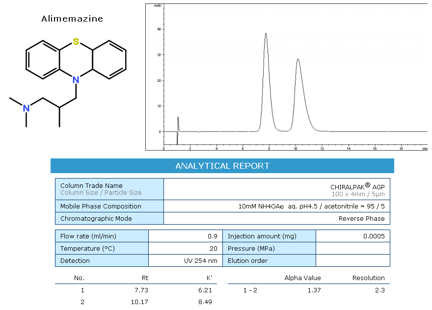 AGP為蛋白質鍵合型手性柱,硅膠表面共價鍵合有α1-酸性糖蛋白。適用于反相系統。 在所有蛋白質鍵合手性柱中,具有最廣泛的適用范圍: 1. 胺類化合物(一級胺,二級胺,三級胺,四級胺類化合物) 2. 酸性化合物(強酸性化合物,弱酸性化合物) 3. 非質子類化合物(酰胺類化合物,酯類化合物,醇類化合物,亞砜類化合物等)